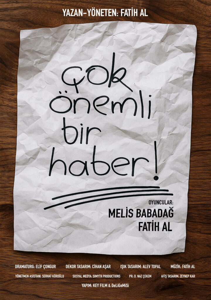 Günümüz insanının görünme arzusu, kendini kanıtlama telaşı ve var olma mücadelesi bu kez sahneye taşınıyor. Key Film ve DeLiGeMİSİ’nin yapımcılığını üstlendiği “Çok Önemli Bir Haber”, 15 Aralık’ta Baba Sahne’de yapacağı prömiyerle tiyatro seyircisiyle buluşacak.