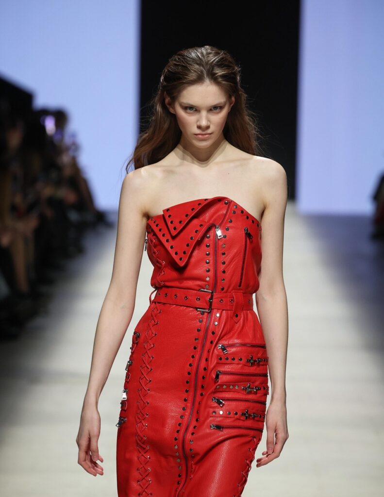 NO APOLOGIES; güçlü omuzlar, yapılandırılmış formlar ve ikinci ten hissi veren deri silüetlerle dikkat çekiyor. Metal detaylar, zımbalar ve troklar savunma değil; karakter ve imza niteliği taşıyor. Yoğun el işçiligi ve parlak yüzeyler, rock’n’roll ruhunu couture disiplinle bir araya getiriyor.