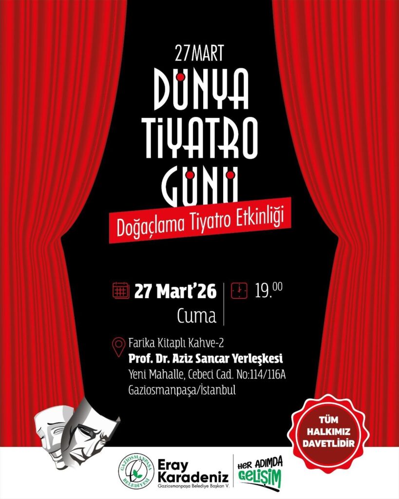 Gaziosmanpaşa Belediyesi olarak, 27 Mart Dünya Tiyatro Günü’nü özel bir programla kutluyoruz. Sanatın birleştirici gücünü vurgulamak ve tiyatronun toplum üzerindeki etkisine dikkat çekmek amacıyla düzenleyeceğimiz “Doğaçlama Tiyatro” etkinliğinde buluşuyoruz.