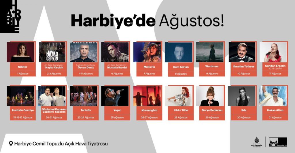 İBB iştiraki Kültür A.Ş. bünyesindeki Harbiye Cemil Topuzlu Açık Hava Tiyatrosu, bu yaz da dopdolu bir programla İstanbulluları ağırlıyor. Ağustos ayı boyunca sevilen sanatçıların konserleri ve İstanbul Şehir Tiyatroları’nın açık hava oyunları, sanatseverlerle buluşacak.
