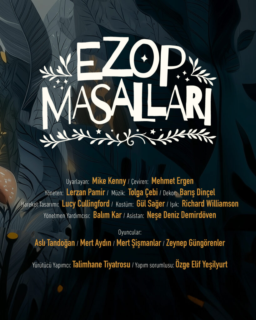 Mike Kenny’nin uyarladığı, Mehmet Ergen’in Türkçe’ye çevirdiği Ezop Masalları’nın, Lerzan Pamir yönetiminde, Aslı Tandoğan, Mert Aydın, Mert Şişmanlar ve Zeynep Güngörenler oyunculuğuyla sahnelenecek masalsı oyun, 4-8 yaş arası çocuklar için müziğin ön planda olduğu interaktif bir anlatımla perdelerini açıyor.